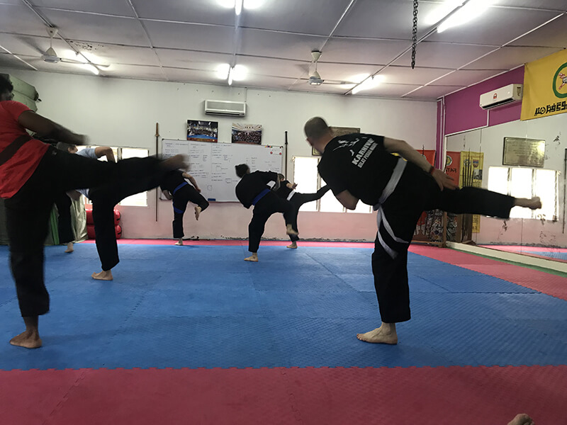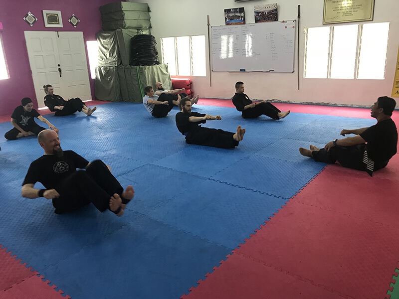 Arrivés un samedi, nous avons commencé les entraînements le soir-même. Les élèves, dans leur très grande majorité, étaient déjà bien avancés dans leurs niveaux respectif mais l’entraînement a tout de même été intensif. Ils ont ainsi pu revoir en détail le programme de leurs ceintures respectives et voir par ailleurs d’autres choses. Ils ont surtout pu goûter aux attentions toutes particulières que Cikgu Halim porte aux entraînement bien spécifiques des bras, des jambes et des abdominaux :p