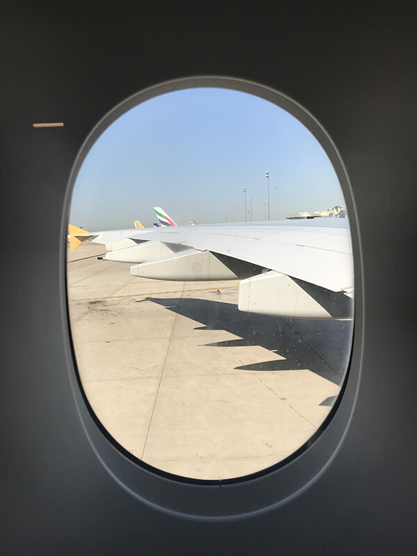 Une fois la troupe au complet, et l’enregistrement ayant déjà été fait en ligne, nous n’avons eu qu’à déposer les bagages et à nous diriger vers la porte d’embarquement. Le premier vol vers Abu Dabi s’est fait dans un A380. Belle bête 😉 Très confortable avec des écrans au top pour passer le temps.