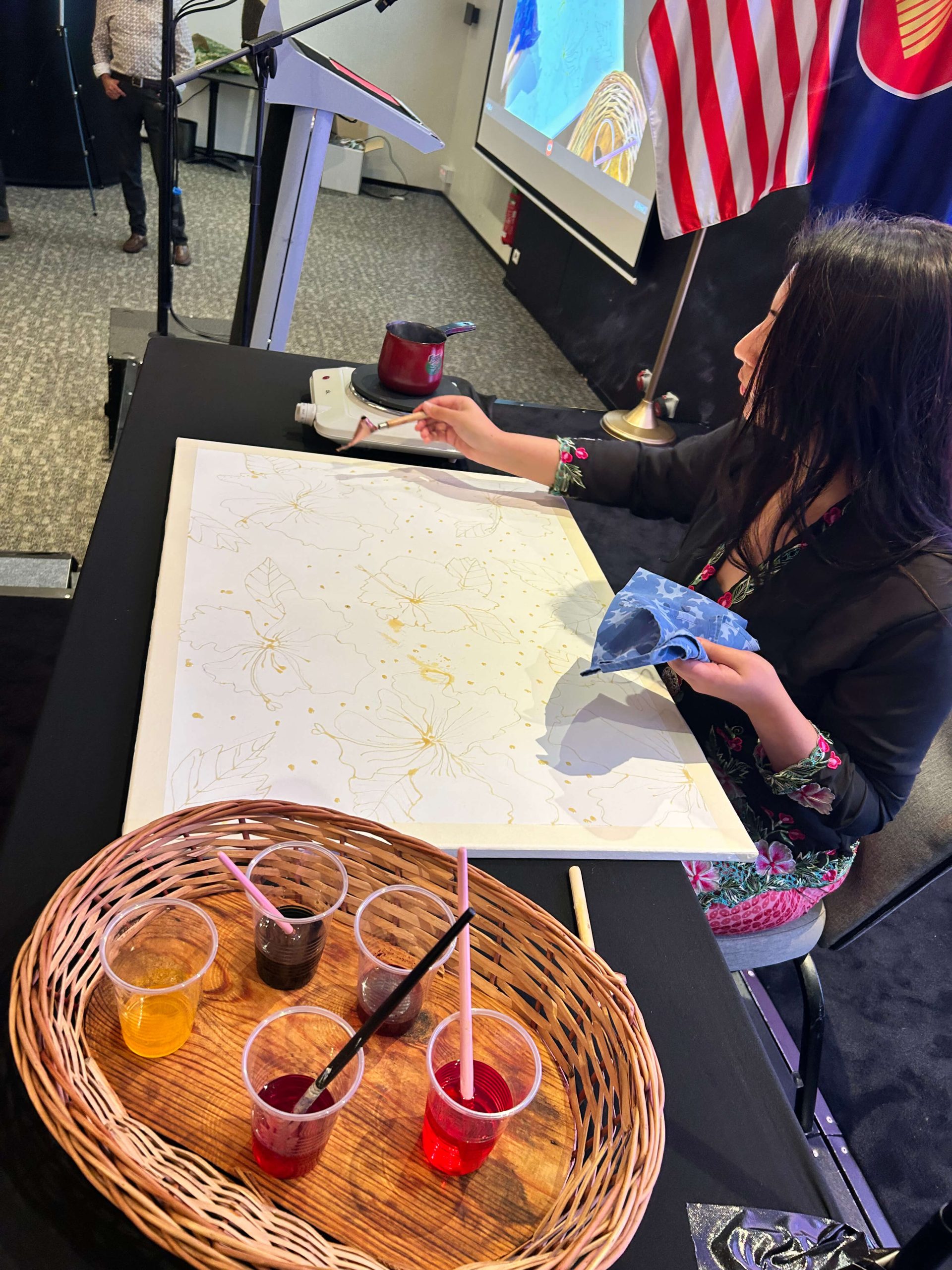 Outre le Silat, une démonstration de batik (technique d’impression sur tissu) a été organisée par la fille de Son Excellence Dato’ Mohd Khalid. En l’espace de quelques minutes, elle a réussi à produire, bien qu’incomplète faute de temps, une pièce de tissu impressionnante ! Bien entendu, un buffet de cuisine malaisienne est resté ouvert tout au long de la soirée, proposant des plats allant du rendang aux onde-onde, en passant par les traditionnelles sate ayam 😉