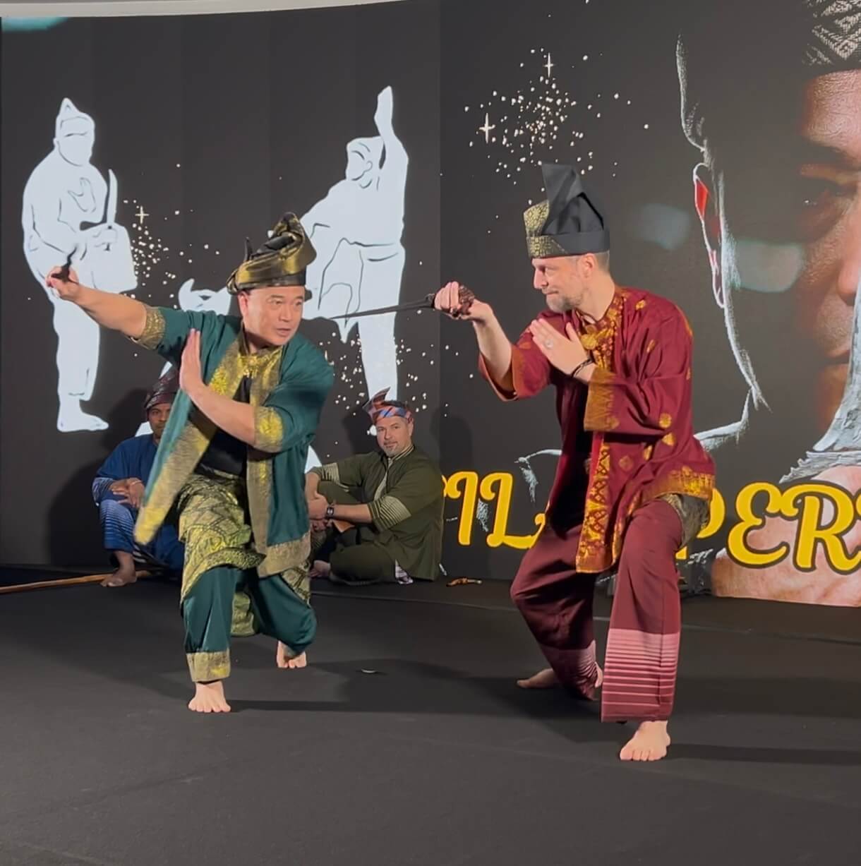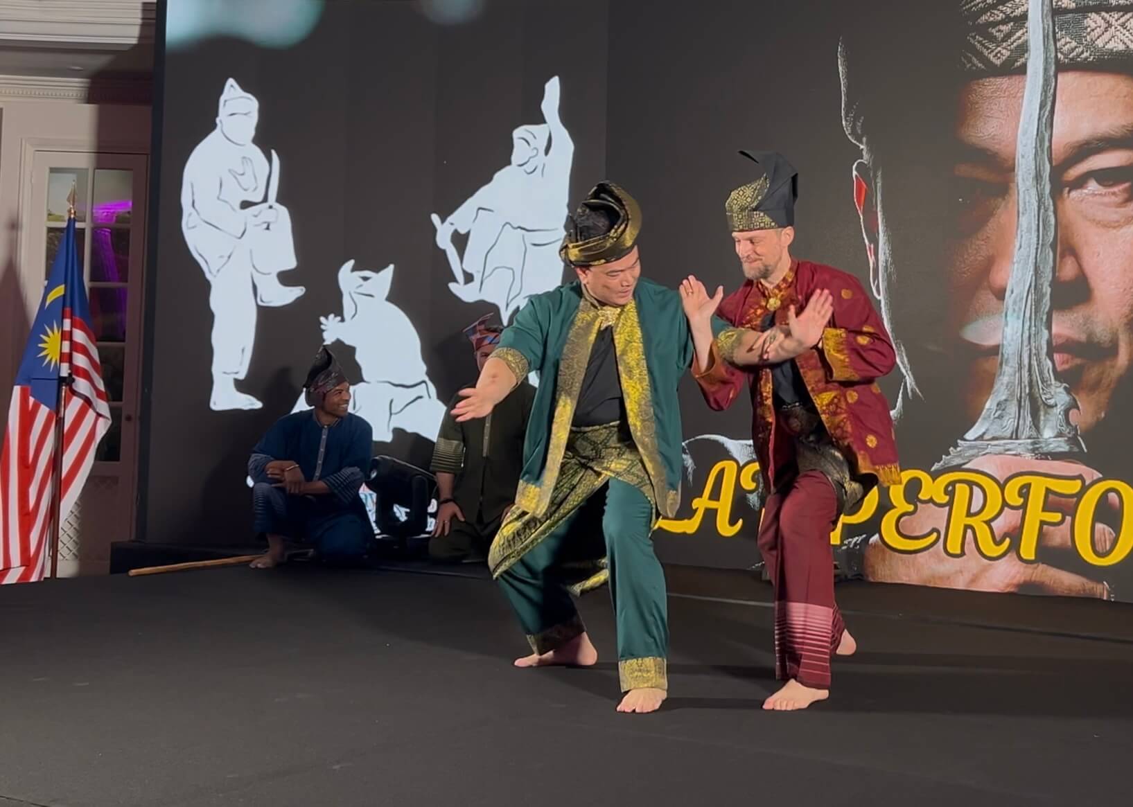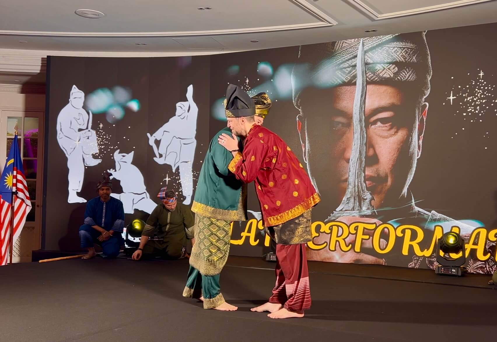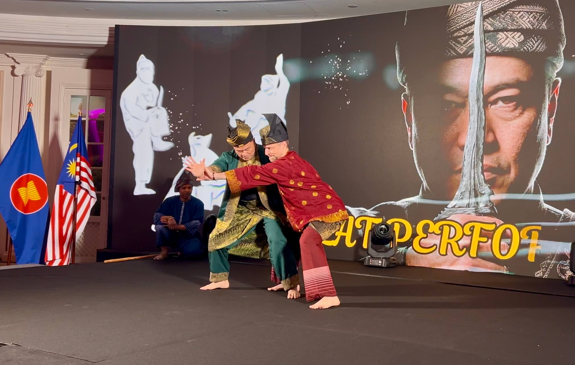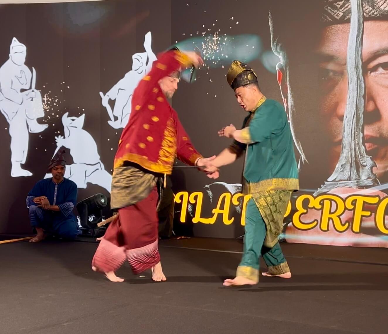 Alors que notre équipe a présenté un Bunga avec quatre armes différentes (keris, kerambit, parang et kayu), Son Excellence a souhaité exécuter un tempur seni (forme de combat traditionnel) avec Cikgu Audran. Et que l’ambassadeur lui-même participe, ça a fait son petit effet auprès des invités 😀