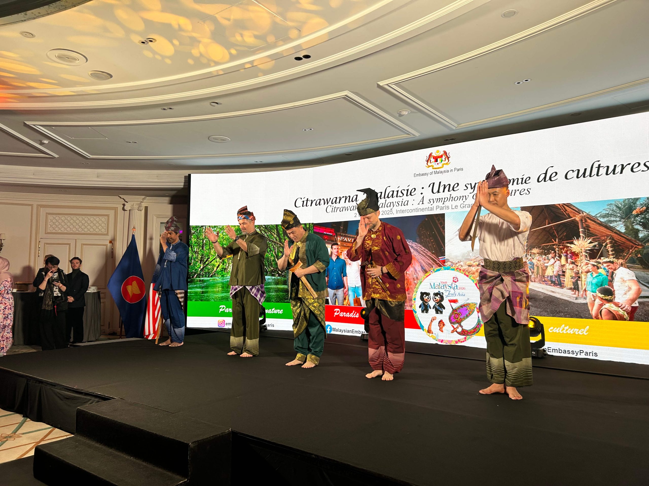 Le 2 décembre 2025 s’est déroulée la cérémonie de lancement de la campagne de promotion touristique « Visit Malaysia 2026 » dans le salon Berlioz du Grand Intercontinental de Paris. A cette occasion, l’ambassade de Malaisie a invité quatre pesilat à venir présenter le Seni Gayung Fatani, avec la participation exceptionnelle de Son Excellence Datuk Eldeen Husaini Mohd Hashim, ambassadeur de Malaisie pour la France et pratiquant de notre style.